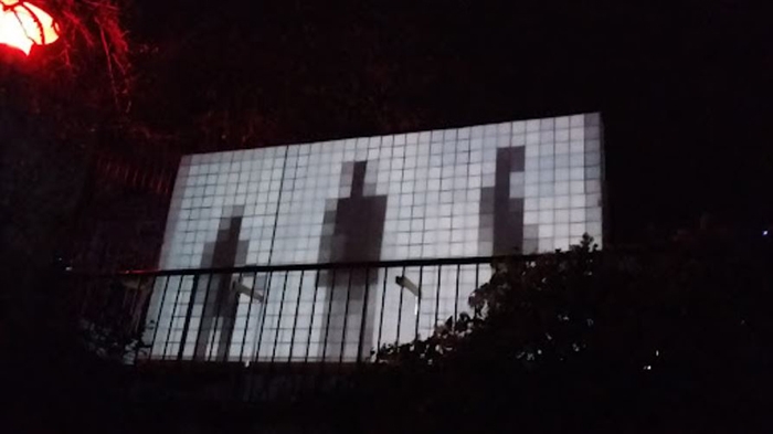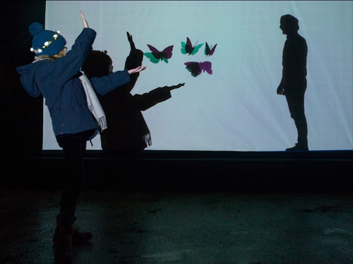 Presence speaks, in a playful way, about the matter of truth in the digital era. The installation provokes the user to discover the two sides of the installation and to be both spectator and performer. A wall of pixels is showing moving silhouettes towards the public from the lower side of the garden, while visitors coming from the upper side are invited to interact with projected shadows.